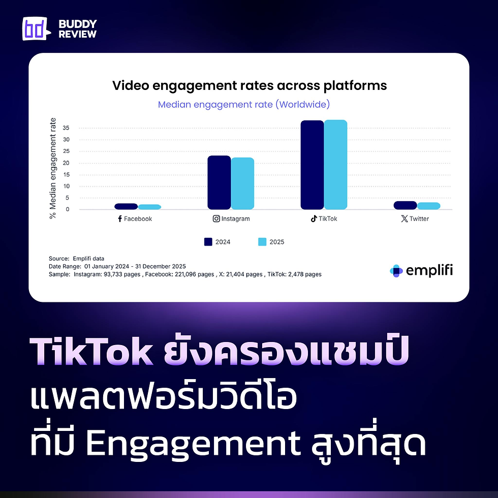 แพลตฟอร์ม TikTok ยังคงยืนหนึ่งด้วยอัตราการมีส่วนร่วมที่สูงทะลุ 35% ทั้งในปี 2024 และ 2025 รองลงมาคือ Instagram ที่รักษาระดับไว้ได้เกิน 20%